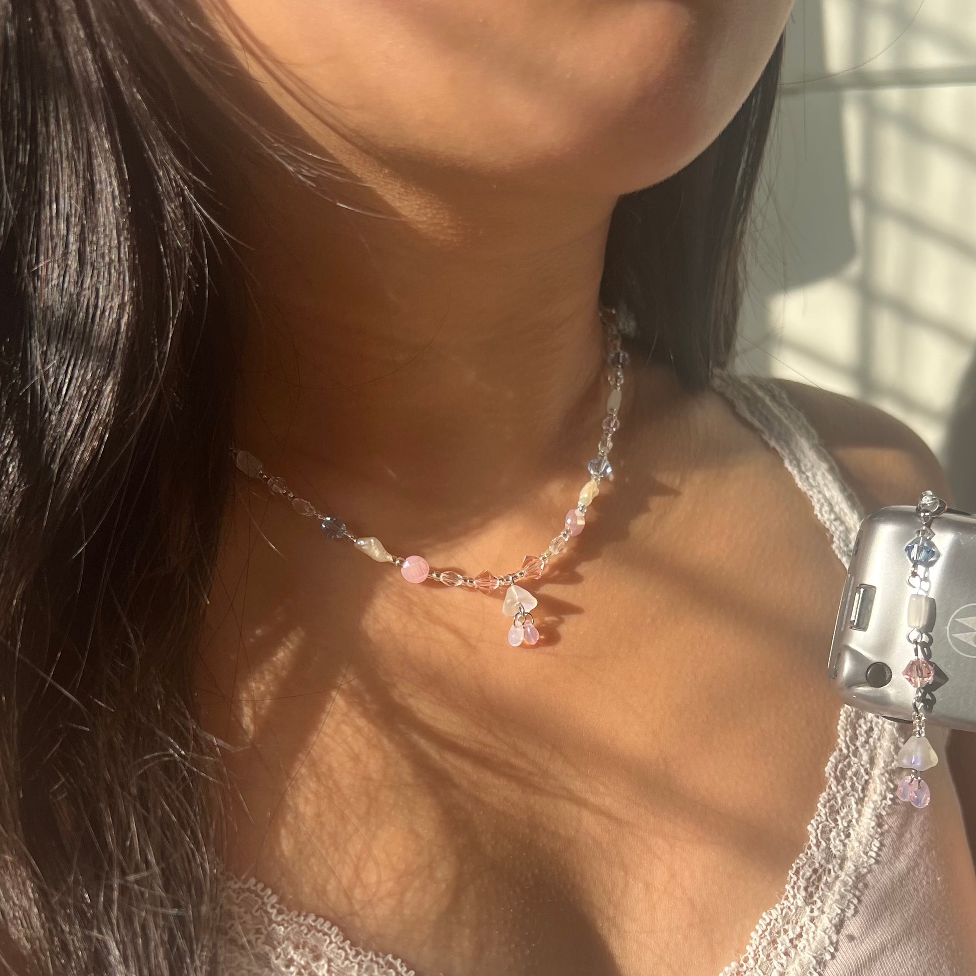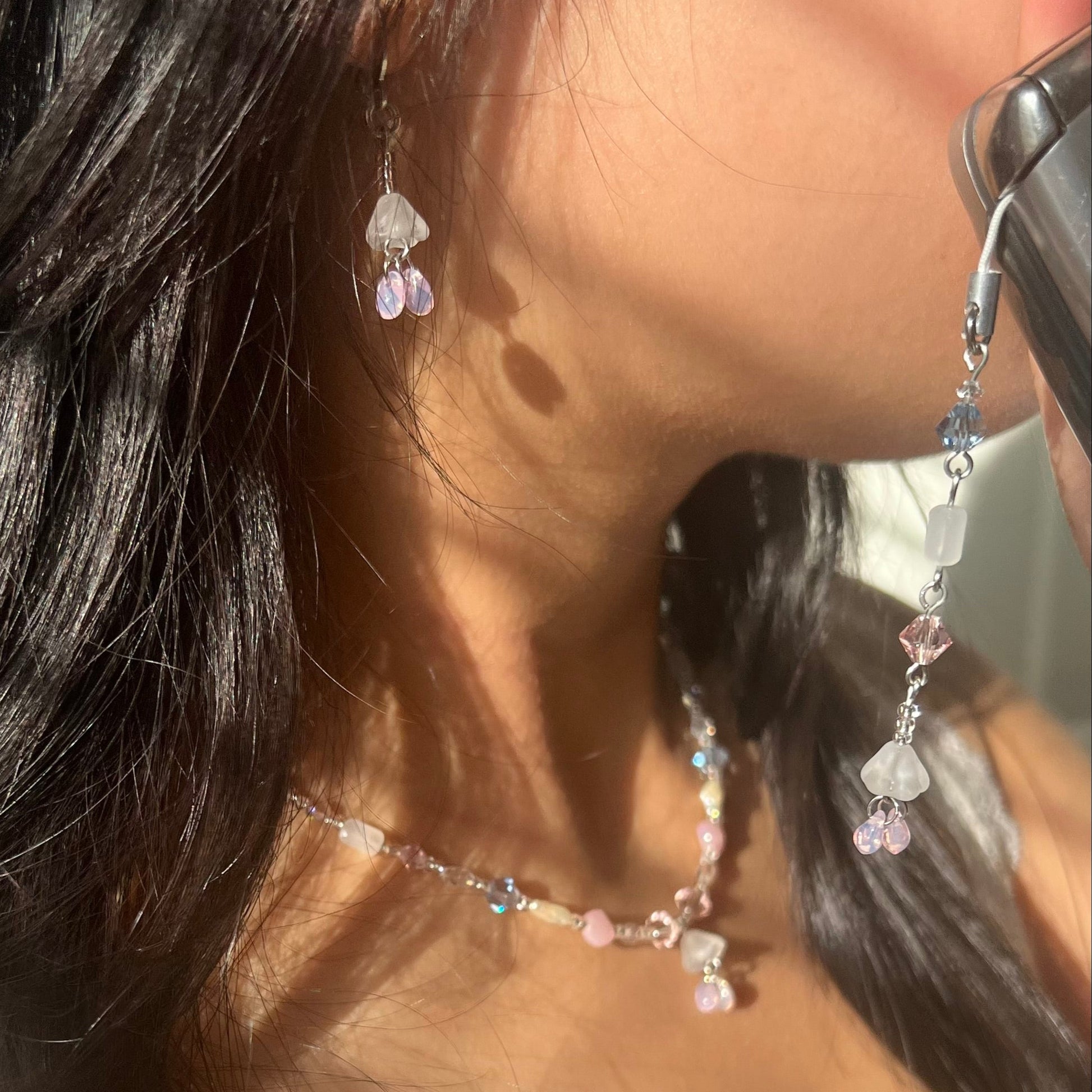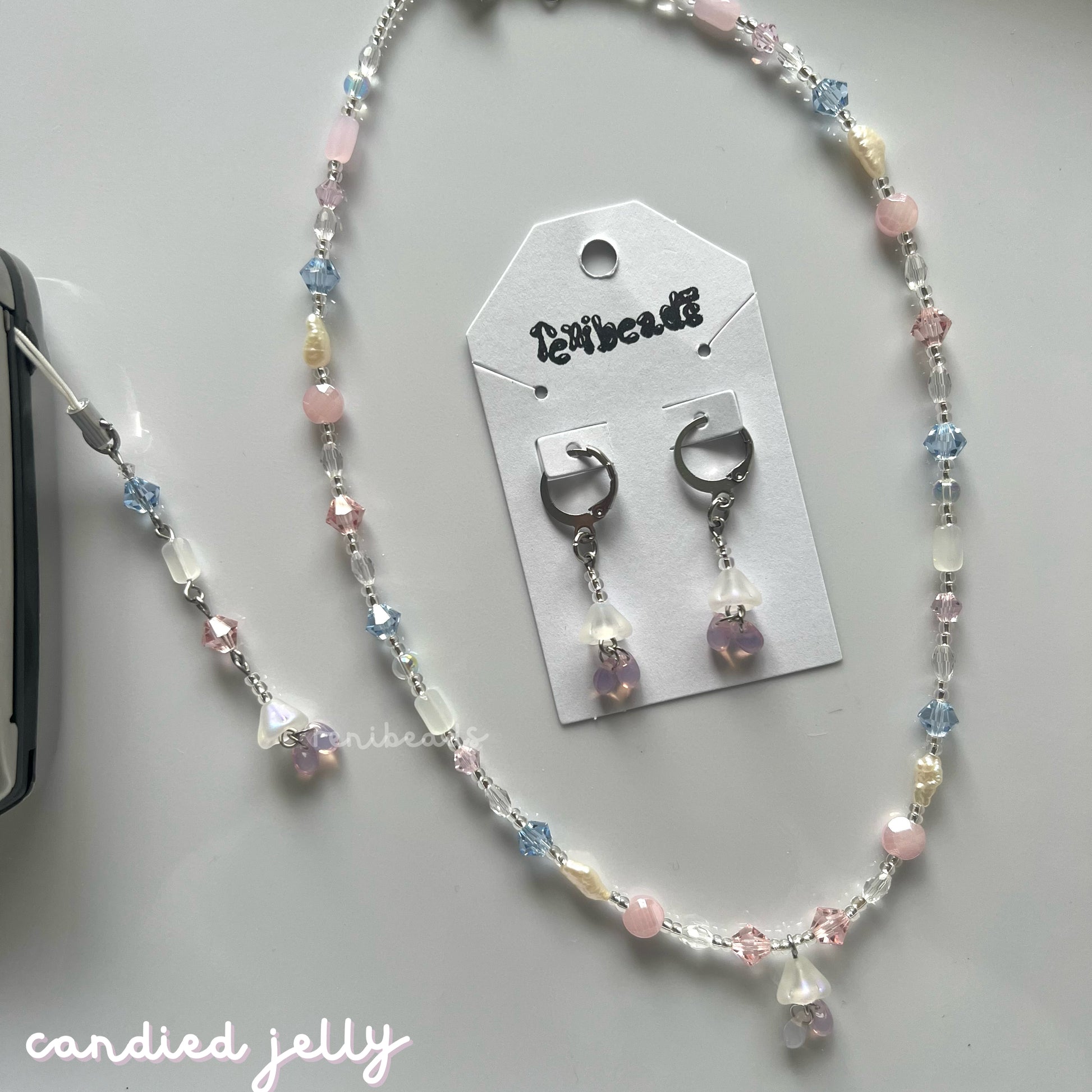 You will receive the candied jelly necklace, matching hoop earrings, and a dainty beaded charm to attach to your digicams, phones, binders, etc!