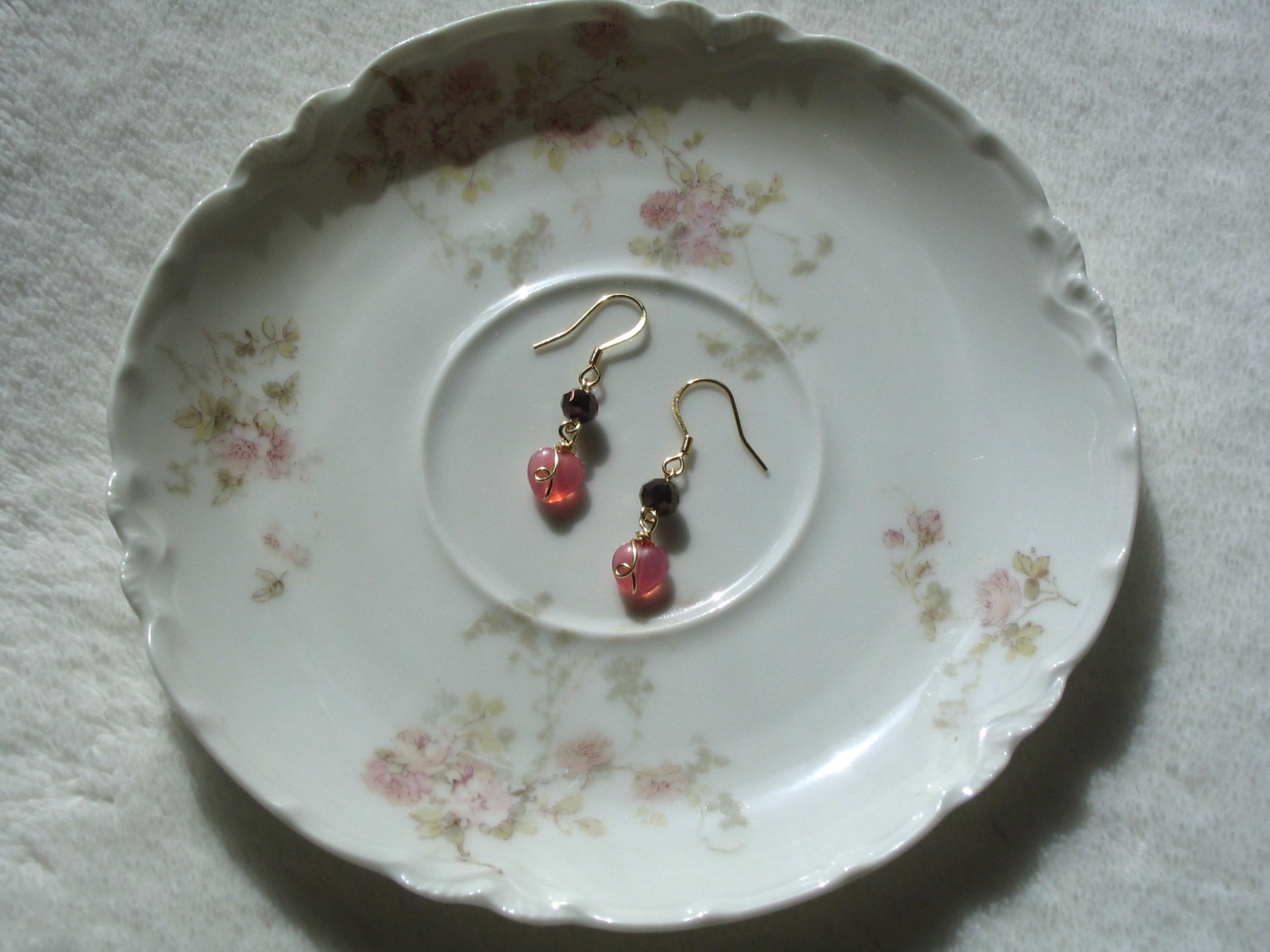 handwrapped watermelon quartz heart bead with gold non tarnish wire + glass - stainless steel hypoallergenic hooks + comes with rubber backing