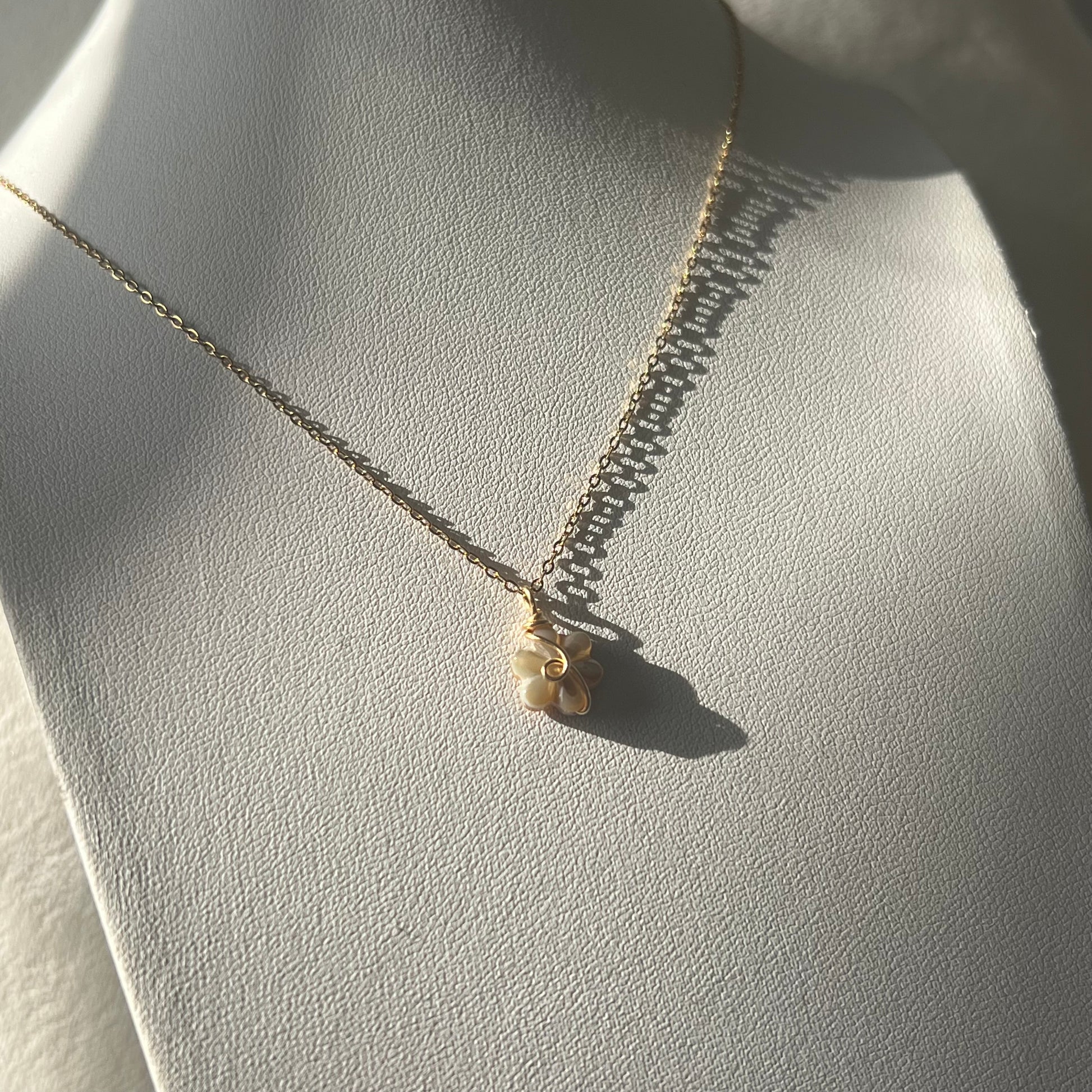 Daisy shell pendant is 1.5x1.5cm and hand wire wrapped with gold plated wire attached to an 18k plated stainless steel dainty chain (17 inches in length) necklace chain is water safe! Perfect spring/summer jewelry for those beach days 🐚💗