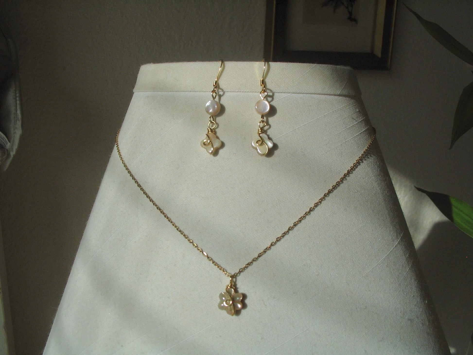 Comes with gold dangle clover shell earrings - using the same wire + hypoallergenic 18k plated stainless steel hooks